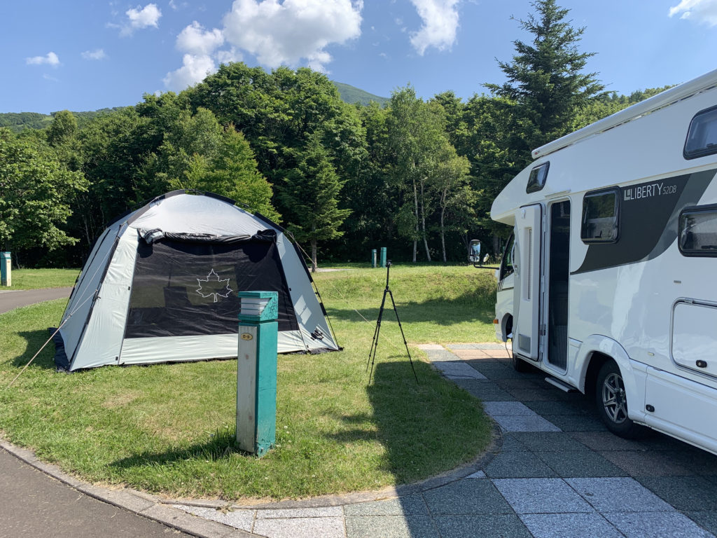 朝から立て続けに3本ほどミーティング、自分のタスクも順調に進みます。お昼に時間があったので、月曜日から4日間確保できた海側のキャンプサイトに移動して、日中に外で作業ができるようにロゴスのデビルブロックスクリーンシェードを設置しました。このスクリーンシェードは、幕の素材が特殊で日光をしっかりと遮ってくれて、折り畳み傘のように簡単に張れる仕組みになっています。ポータブル電源はスクリーンシェードの中に入れ、ソーラーパネルも設置、ポータブル電源のACに外部電源用の電源ケーブルを繋ぎます。これでポータブル電源をソーラーで充電しながら、キャンピングカーにも電力をある程度送れるようになります。EcoFlowのRiver600Proはスマフォからアプリで遠隔操作ができるので、ポータブル電源の蓄電量が落ちてきたら、キャンピングカーの中にいても、リモートでACを切ることができます。天気さえ良ければ、素晴らしいオフグリッド事務所になります。日中はキャンプ場の標高があまり高くないので、キャンピングカーの中は30度近くになります(北海道はもう夏です)、ベンチレータフル稼働かエアコンが必要になる状況です。エアコンを長時間使えないので、省エネのためにスクリーンシェードの中でも仕事をします。スクリーンシェードの中であれば、陽射しを避けながら、そよ風も入ってくるので案外過ごしやすいです。