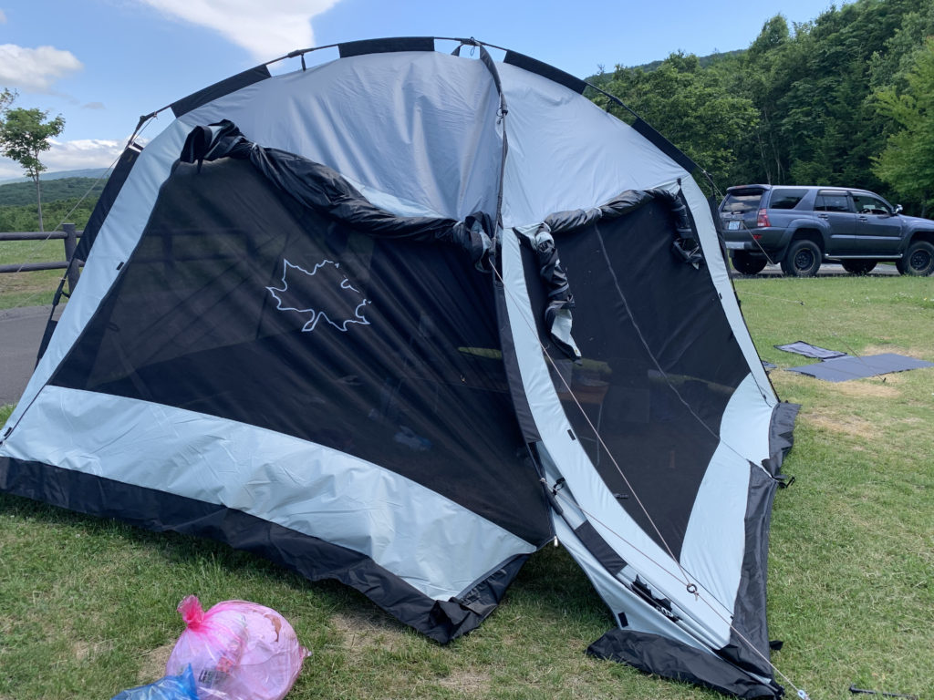 平日ワーケーション5日目、金曜日、昨夜から風が強くなり、雨も降り始めた。夜中は強風でロゴスのデビルブロックが、吹き飛ぶのではないかと心配で、なんども起きることに。考えてみれば海が見える高台、強風になることもあるよね。それにしてもデビルブロックのヘタレっぷりには驚愕、すこし強い風が吹くとサイドポールがぐにゃっと折れて(プラスチック製だから?)、トップにある柱4本を束ねるソケットが4本のサイドポールを支えられなくなり、天井が落ちてきて潰れるという・・・。こりゃ使い物にならないなという結論に。直射日光や虫をしっかり抑えてくれる幕が気に入り、かつ折りたたみのワンタッチ式なので、キャンピングカーにはピッタリと思いましたが・・・ワンタッチ式も微妙に一人では立てにくく、収納しにくく、すぐ倒壊しちゃうので、だめだこりゃという結論になりました。残念、立てるの面倒だけどスノピやオガワのスクリーンタープのほうが、全然良い、もしくはもっと安いので良かったかも・・・。とりあえずこの夏はノルディスクのタープで我慢しようかな。