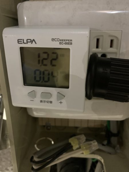 ついでに、FFヒーターの定期運転とRIVER Proの充電を行いました。RIVER Proの600W急速充電、エアコンは18℃の強風設定、AC/DCチャージャーでサブバッテリーの充電を同時に行って、どのくらい外部電源から電力を消費しているのかチェックしましたが1.2Kwぐらいでした。サブバッテリーがある程度充電されていたので、AC/DCチャージャーからの急速充電はそんなに消費していなかったのかも。それにしては、ファンの音がうるさいのですが。。。。