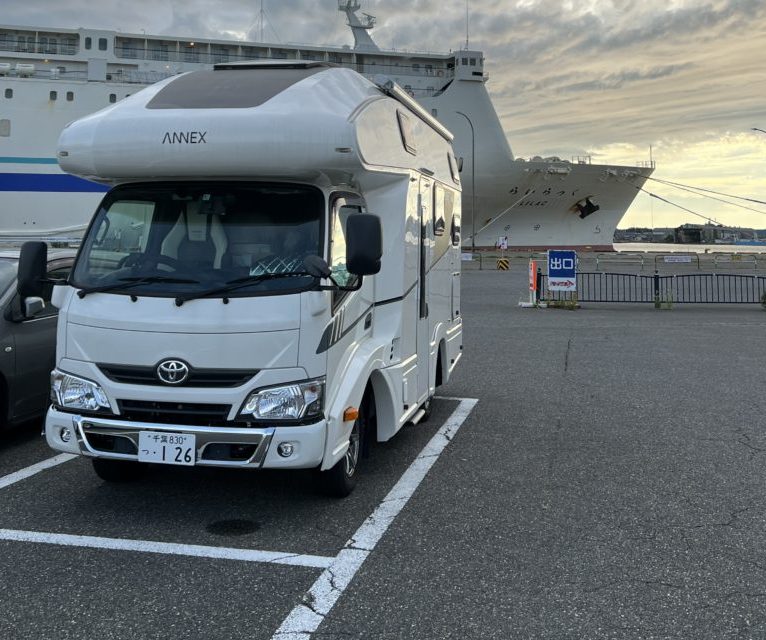 フェリー乗り場の近くにある有名な回転寿司で食べようと思いましたが、1時間半待ちということで、テイクアウトにしてもらいました。待ち時間は15分、キャンピングカーは最高ですね!そのままフェリー乗り場に並んで待ち時間で夕飯をいただきました。