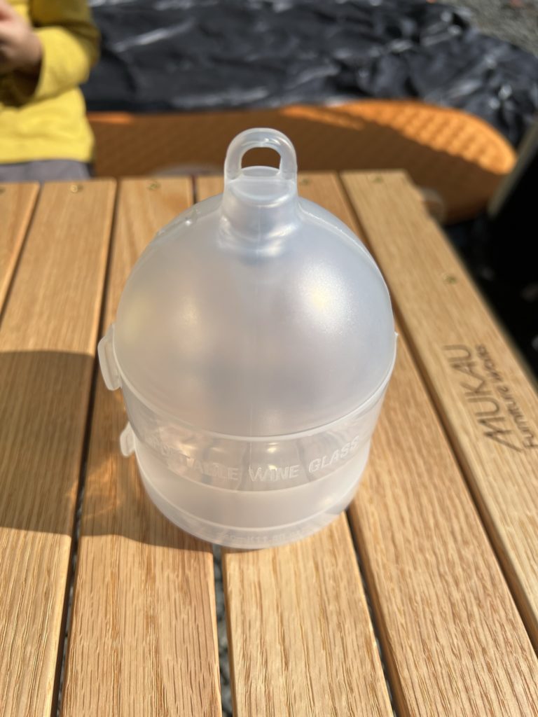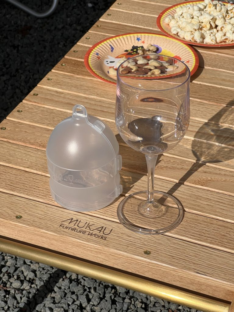 キャンプでのワイングラスはグラスと脚が分解できるグラスを使っています。グラス部分に脚を収納できて、専用のケースもついているので、移動中キャンピングカーが揺れても安心です。