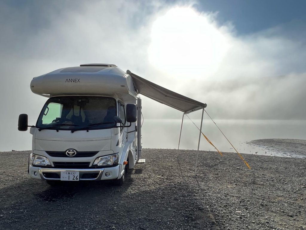 おはようございます。キャンピングカーの車窓から。西湖の朝は霧で凄いです。